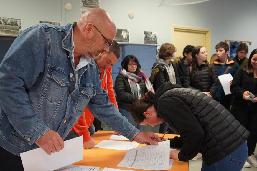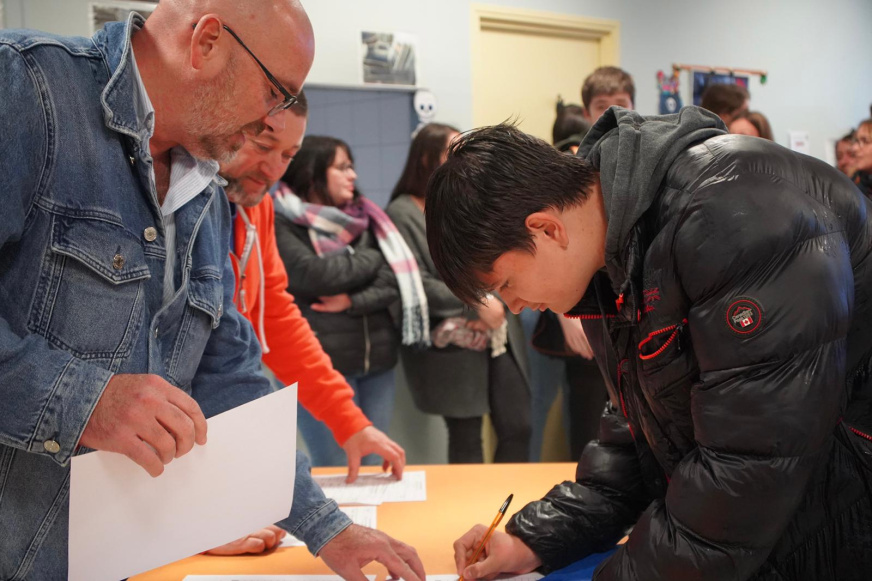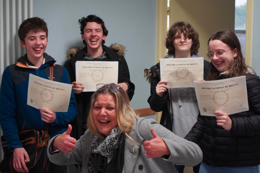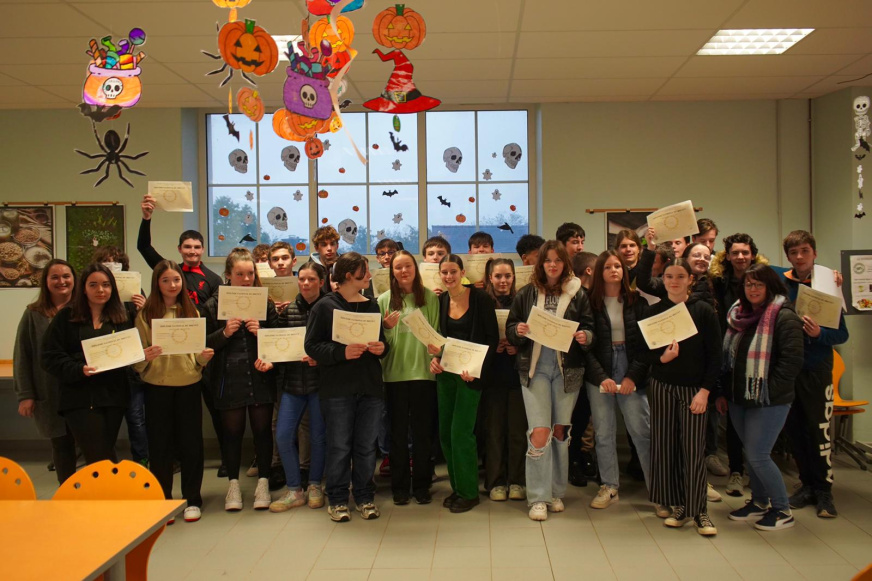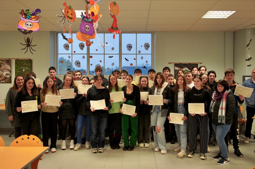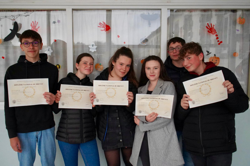 Le vendredi 21 octobre en fin d’après midi, les 34 collégiens qui ont réussi le Diplôme National du Brevet en juin dernier, ainsi que leur famille, ont été reçus au collège pour la remise de leur diplôme. Ils ont été accueillis par le Principal par intérim, Mr HALLEGUEN, leurs anciennes professeures principales Mme LE BORGNE et Mme CARLACH-INCE, la gestionnaire Mme KERDONCUFF, le Conseiller Principal d’Education Mr TEURNIER, le secrétaire Mr FIRRE et les surveillantes Tiphaine, Anna et Margot. Le principal a félicité les diplômés en exprimant sa satisfaction de cette réussite qui est le résultat de l’investissement des jeunes, de l’équipe pédagogique et des familles. Mr FABIEN, professeur de SVT, a profité de l’évènement pour remettre aux élèves, leur diplôme de Premiers secours (PSC1).